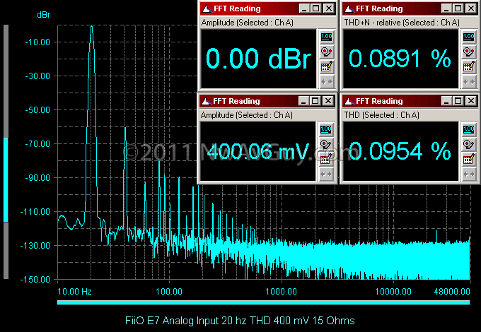 ANALOG THD 20 hz 15 OHMS: Measuring THD at 20 hz into a difficult load stresses an amplifier in different ways. It requires sustained amounts of current from the power supply and stresses any electrolytic coupling (DC blocking) capacitors in the signal path. It can even reveal thermal distortion in the output devices. The distortion of the E7 rises from 0.012% at 1 khz into 15 ohms to about 0.09% at 20 hz. But the good news is it’s almost all 2nd harmonic which is the least audible. The third harmonic is down over 90 dB. The ear is also less sensitive to low frequency distortion. This is likely related to the negative rail power supply and/or power supply filtering in the E7. The FiiO E5 also suffers from rising low frequency distortion but it’s about ten times higher. Overall this is respectable performance for a battery powered device generating its own power supply and nearly anyone would consider this inaudible: