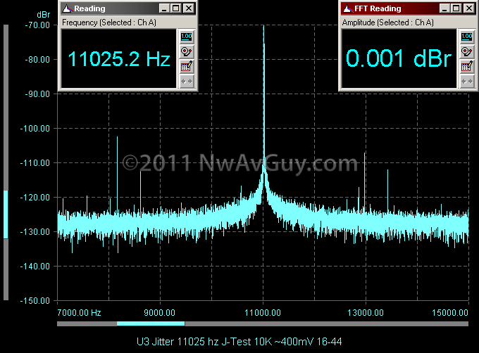 JITTER: The U3’s performance on the dScope jitter J-Test was a bit odd and inferior to the excellent performance from the X-Fi. It is similar to the UCA202 with the “spread” at the base of the 11025hz signal indicating some significant low frequency jitter. What’s odd is there’s a lack of any notable symmetrical side bands—normally the “markers” for high frequency jitter. The spikes present are more likely noise or distortion artifacts and not related to jitter as they’re not symmetrical. I wish I could correlate this to sound quality but I cannot (see my Jitter article for more). I plan to research jitter more in the future. The second graph shows the X-Fi result for comparison and the third shows the UCA202: